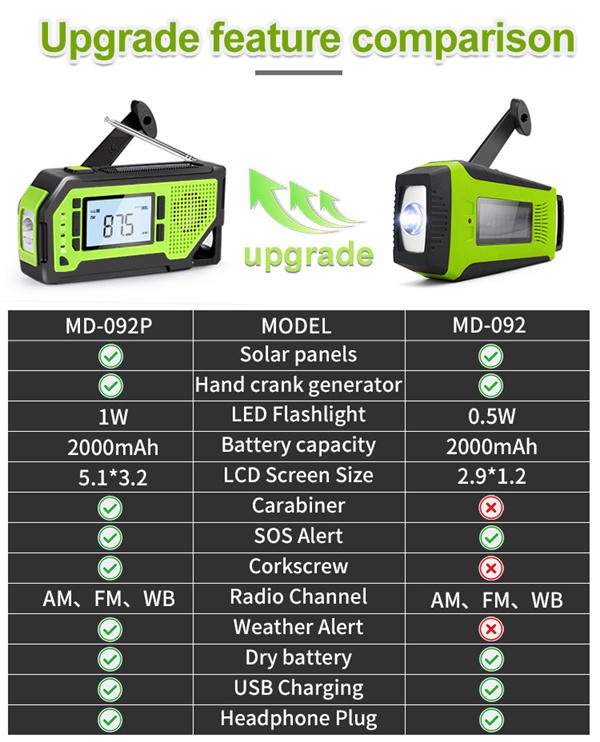 • MD-092P 2000mAh Solar Hand-Crank Emergency Weather Radio