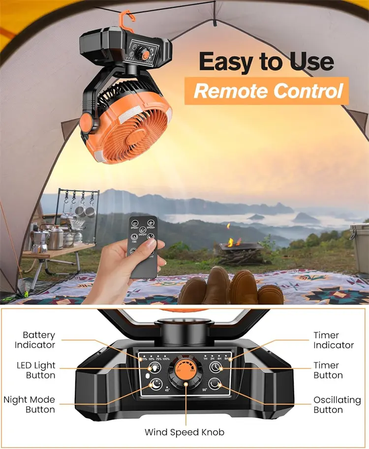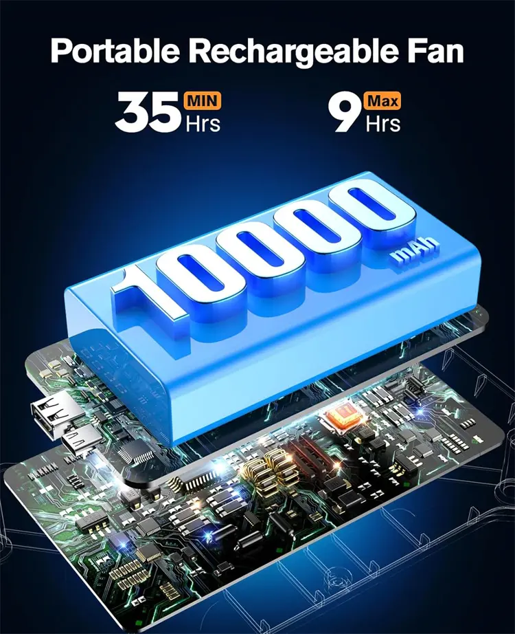 High-Capacity Rechargeable Battery:Powered by a 16,000mAh battery, providing hours of cooling and lighting for outdoor activities.