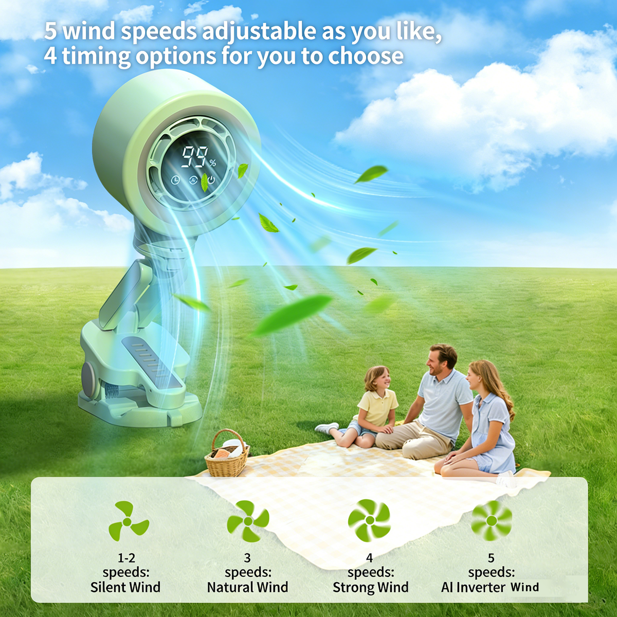 - 5 Speed Settings: Includes 4 fixed speeds and 1 natural breeze mode.